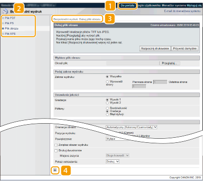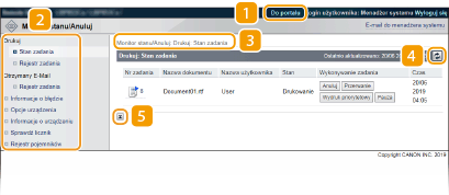 Wyświetla stronę [Monitor stanu/Anuluj]. Możesz użyć tej strony aby sprawdzić aktualny status drukowania, anulować przetwarzanie drukowania i wyświetlić historię zadań drukowania.
