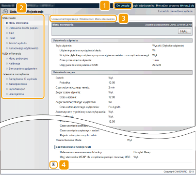 Menu na stronie [Ustawienia/Rejestracja]Ustawienia na stronie [Ustawienia/Rejestracja] można zmienić dopiero po zalogowaniu się w trybie zarządzania. Jeśli użytkownik zaloguje się w trybie użytkownika ogólnego, opcje [Menu podręczne], [Kalibracja], [Sterowanie urządzeniem], [Zarządzanie ID wydziału] i [Import/eksport] nie są wyświetlane. |