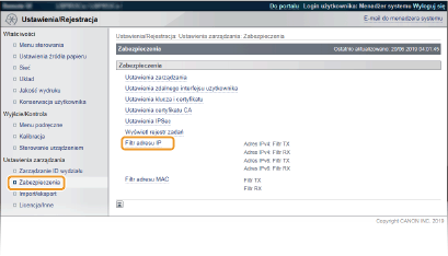 4 | Zaznacz pole wyboru [Użyj filtra] i kliknij przycisk radiowy [Odrzuć] lub [Zezwól], aby określić zasady [Polityka domyślna]. [Użyj filtra] Zaznaczenie tego pola wyboru umożliwi ograniczenie komunikacji. Usunięcie zaznaczenia pola wyboru wyłącza to ograniczenie. [Polityka domyślna] Wybór warunku wstępnego w celu udzielenia zezwoleń lub braku zezwoleń na komunikację innych urządzeń z tym urządzeniem. [Zezwól] | Wybierz tę opcję, aby blokować pakiety komunikacyjne z urządzeń o adresach IP wprowadzonych w polu [Wyjątki adresów] lub do takich urządzeń przesyłane. Komunikacja z innymi urządzeniami jest dozwolona. | [Odrzuć] | Wybierz tę opcję, aby przepuszczać pakiety komunikacyjne jedynie z urządzeń o adresach IP wprowadzonych w polu [Wyjątki adresów] lub do takich urządzeń przesyłane. Komunikacja z innymi urządzeniami jest zabroniona. |