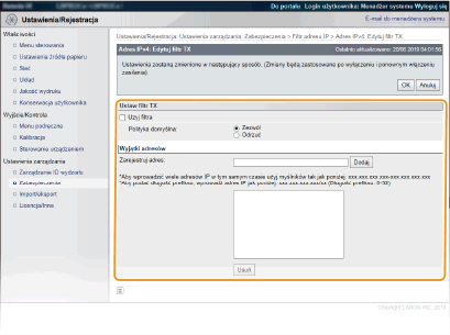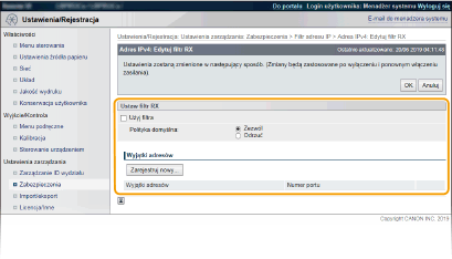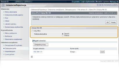 W przypadku wybrania opcji [Zezwól] w ustawieniu [Polityka domyślna] należy określić adresy IP urządzeń, których komunikacja z tym urządzeniem ma być zablokowana. Wybierając opcję [Odrzuć] w ustawieniu [Polityka domyślna], należy określić adresy IP urządzeń, które powinny się komunikować z tym urządzeniem.