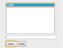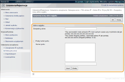 2 | Określ wyjątki adresów. Wprowadź adres IP (lub zakres adresów IP) w polu [Zarejestruj adres]. Aby określić numer portu, zaznacz pole wyboru [Podaj numer portu], wpisz numer portu w polu [Numer portu] i kliknij przycisk [Dodaj]. Sprawdzanie poprawności wpisów Nieprawidłowo wprowadzone adresy IP lub numery portów mogą uniemożliwić dostęp do urządzenia z poziomu Zdalnego interfejsu użytkownika. Konieczne będzie wtedy ustawienie filtra <Filtr adresów> na wartość <Wyłącz>. Filtr adresówUsuwanie ustawionego numeru portu Wybierz numer portu do usunięcia i kliknij [Usuń]. |