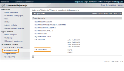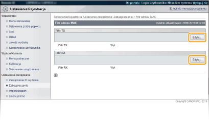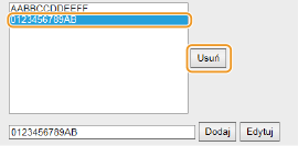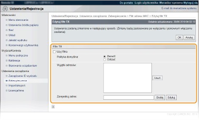Nie ma konieczności oddzielania adresów myślnikami lub dwukropkami. Sprawdzanie poprawności wpisów Nieprawidłowo wprowadzone adresy MAC mogą uniemożliwić dostęp do urządzenia z poziomu Zdalnego interfejsu użytkownika. Konieczne będzie wtedy ustawienie filtra <Filtr adresów> na wartość <Wyłącz>. Filtr adresów Po wybraniu opcji [Odrzuć] w obszarze [Polityka domyślna] Pakiety wychodzące multiemisji i rozgłaszania nie mogą zostać przefiltrowane. Usuwanie adresu MAC z listy wyjątków Zaznacz adres MAC i kliknij przycisk [Usuń]. |