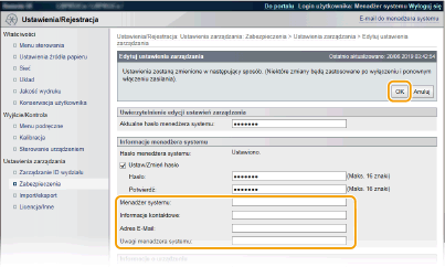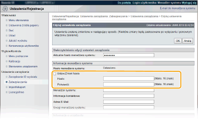 Do zmiany ustawień skonfigurowanych dla urządzenia z poziomu Zdalnego interfejsu użytkownika konieczne są uprawnienia administratora. Aby zmienić hasło menedżera systemu, należy wykonać opisaną poniżej procedurę. Informacje dotyczące ustawiania hasła menedżera systemu mają krytyczne znaczenie dla bezpieczeństwa urządzenia, dlatego należy się upewnić, że hasło menedżera systemu znają wyłącznie administratorzy.