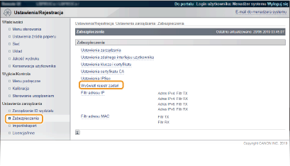 W celu ochrony prywatności użytkowników można wyłączyć wyświetlanie historii zadań drukowania na ekranie Zdalnego interfejsu użytkownika oraz drukowanie listy historii wydruków. Historia zadań drukowania będzie aktualizowana i utrzymywana, nawet jeśli zostanie ukryta, tak aby administratorzy mogli ją w razie potrzeby przejrzeć.