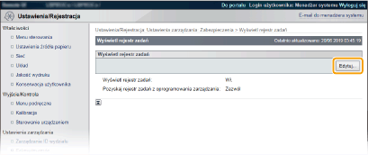 Jeśli to pole wyboru zostanie zaznaczone, historię zadań drukowania będzie można uzyskać za pomocą oprogramowania do zarządzania urządzeniami, takiego jak iW Management Console. Aby wyłączyć możliwość uzyskiwania historii zadań drukowania przez oprogramowanie do zarządzania, należy usunąć zaznaczenie tego pola wyboru. Ta funkcja jest automatycznie włączona, gdy zaznaczone jest pole wyboru [Wyświetl rejestr zadań].