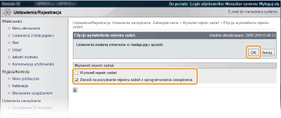 Jeśli to pole wyboru nie zostanie zaznaczone, historia zadań drukowania nie będzie wyświetlana na ekranie Zdalnego interfejsu użytkownika ani nie będzie można wydrukować listy historii wydruków. Aby wyświetlać historię zadań, należy zaznaczyć to pole wyboru.