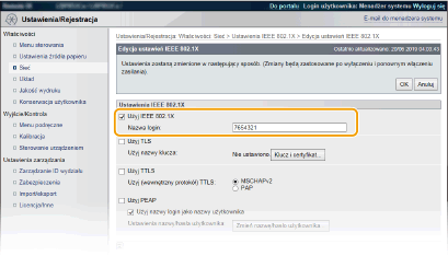 Zaznacz pole wyboru [Użyj IEEE 802.1X], wprowadź nazwę logowania w polu tekstowym [Nazwa login] i wybierz odpowiednie ustawienia.