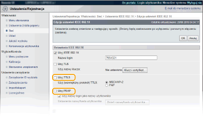 W tej metodzie uwierzytelniania korzysta się z nazwy użytkownika i hasła do uwierzytelniania urządzenia klienckiego, jak również certyfikatu CA do uwierzytelniania serwera. Protokół MSCHAPv2 lub PAP można wybrać jako protokół wewnętrzny. Protokołów TTLS i PEAP można używać równolegle. Przed określeniem metody uwierzytelniania włącz szyfrowanie TLS dla Zdalnego interfejsu użytkownika (