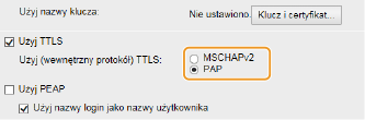 1 | Zaznacz pole wyboru [Użyj TTLS] lub [Użyj PEAP]. Wewnętrzny protokół TTLS Dostępne są opcje MSCHAPv2 lub PAP. Aby wybrać opcję PAP, kliknij przycisk radiowy [PAP]. |