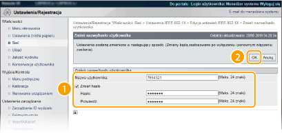 3 | Wprowadź nazwę użytkownika/hasło i kliknij przycisk [OK]. [Nazwa użytkownika] Wprowadź nazwę użytkownika składającą się ze znaków alfanumerycznych. [Zmień hasło] Aby wprowadzić lub zmienić hasło, należy zaznaczyć to pole wyboru i wprowadzić nowe hasło za pomocą znaków alfanumerycznych w polach tekstowych [Hasło] oraz [Potwierdź]. |