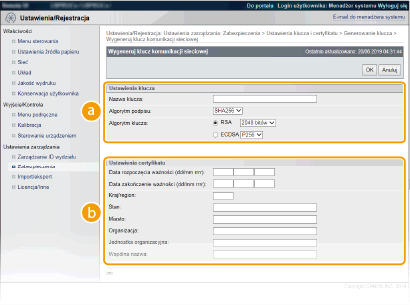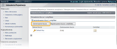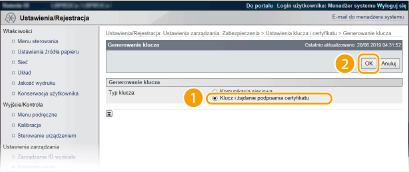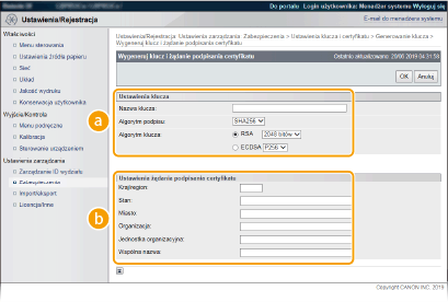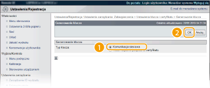 Parę kluczy można wygenerować za pomocą urządzenia, jeżeli wymaga tego komunikacja szyfrowana z użyciem protokołu TLS (Transport Layer Security). Z protokołu TLS można korzystać podczas udzielania dostępu do urządzenia przez zdalny interfejs użytkownika lub drukowania IPP. Można zarejestrować maksymalnie osiem par kluczy, w tym kluczy zainstalowanych fabrycznie. Wraz z parami kluczy wygenerowanymi dla łączności sieciowej używane są certyfikaty z podpisem własnym. Wraz z kluczem i żądaniem podpisania certyfikatu (CSR) można wysłać wniosek o certyfikat cyfrowy CA dla pary kluczy wygenerowanej przez urządzenie.