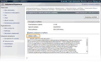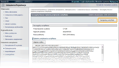 Z pary kluczy wygenerowanych przez żądanie podpisania certyfikatu (CSR) nie można korzystać do momentu zarejestrowania certyfikatu. Certyfikat cyfrowy wydany przez urząd certyfikacji należy zarejestrować, korzystając z poniższej procedury.