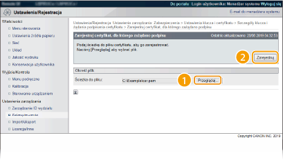 Kliknij przycisk [Przeglądaj] w oknie [Ścieżka do pliku], wybierz plik żądania podpisania certyfikatu, a następnie kliknij przycisk [Zarejestruj].