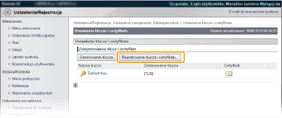 Rejestracja kluczy i certyfikatów). Można zarejestrować maksymalnie 8 par kluczy (łącznie z tymi fabrycznie zainstalowanymi) i do 150 certyfikatów urzędu certyfikacji (łącznie z fabrycznie zainstalowanymi 72 certyfikatami).