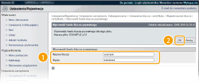 2 | Wprowadź kolejno nazwę pary kluczy i hasło, a następnie kliknij przycisk [OK]. [Nazwa klucza] Używając znaków alfanumerycznych, należy w tym polu wprowadzić nazwę rejestrowanej pary kluczy. [Hasło] Używając znaków alfanumerycznych, należy w tym polu wprowadzić hasło prywatnego klucza dla rejestrowanego pliku. |