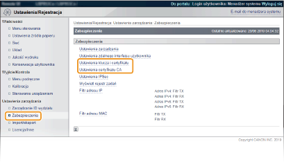 [Ustawienia klucza i certyfikatu] lub [Ustawienia certyfikatu CA].