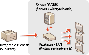 IEEE 802.1X to standard i mechanizm blokujący nieupoważniony dostęp do sieci dzięki zbiorowemu zarządzaniu informacjami dotyczącymi uwierzytelniania użytkowników. Każde urządzenie, które próbuje nawiązać połączenie z siecią 802.1X, zostaje poddane procesowi uwierzytelnienia, aby potwierdzić uprawnienia użytkownika. Informacje uwierzytelniające są wysyłane na serwer RADIUS i tam sprawdzane. Serwer zezwala na nawiązanie komunikacji lub odrzuca próbę w zależności od wyniku procesu uwierzytelniania. Jeśli uwierzytelnianie zostanie zakończone niepowodzeniem, przełącznik sieci LAN blokuje dostęp spoza sieci. Urządzenie można podłączyć do sieci 802.1X jako urządzenie klienckie.