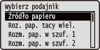 ![]() | Lista ustawień dotyczących źródła papieru i rozmiaru papieru załadowanego do urządzenia wraz z krótkimi opisami. Po naciśnięciu przycisku ( ) na panelu roboczym zostaje wyświetlone menu Wybierz podajnik. Ustawienia domyślne są oznaczone znakiem ( ). |