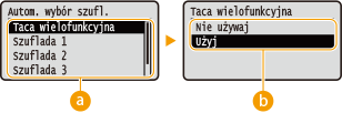 W przypadku wybrania dla opcji <Wielof. dla miesz.> ustawienia <Włącz> pierwszeństwo ma papier podawany z szuflady na papier, nawet jeśli ustawienie opcji <Priorytet tacy wiel.> to <Włącz>. |