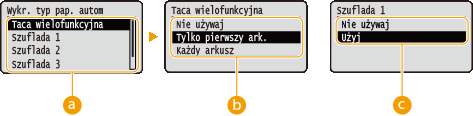 Gdy ta funkcja jest włączona, prędkość drukowania może się zmniejszyć. W przypadku zdefiniowania opcji <Każdy arkusz> prędkość drukowania będzie niższa. Gdy ta funkcja jest włączona, urządzenie może ni być w stanie drukować prawidłowo. Jeżeli urządzenie nie może drukować poprawnie, ustaw dla tej funkcji wartość <Nie używaj> i określ typ papieru w sterowniku drukarki przed ponowną próbą drukowania. |