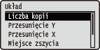 do 9999![]() | Zawiera listę ustawień dotyczących wyglądu wydruku, takich jak marginesy na oprawę i położenia wydruku, wraz z krótkimi opisami. Ustawienia domyślne są oznaczone znakiem ( ). |