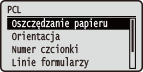 ![]() | Wszystkie ustawienia z listy dotyczące poleceń sterowania PCL są opatrzone krótkim opisem. Ustawienia domyślne oznaczone są przy pomocy znaku ( ). |