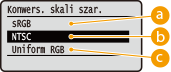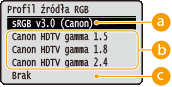 sRGB v3.0 (Canon)  Canon HDTV gamma 1.5 Canon HDTV gamma 1.8 Canon HDTV gamma 2.4 Brak |