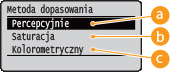 Ta pozycja nie będzie aktywna po wybraniu jednego z poniższych ustawień.<Profil źródła RGB> — ustawienie <Brak>. <Profil symul. CMYK> — ustawienie <Brak>. <Profil skali szar.> — ustawienie <Wyłącz>. |