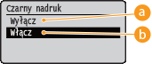 Najpierw zostaną wydrukowane dane po uprzednim wycięciu czarnego tekstu z kolorowego tła lub rysunku, a następnie czarny tekst zostanie nadrukowany na pustą przestrzeń pozostałą po jego wycięciu. Druk może być jaśniejszy niż w przypadku ustawienia <Włącz>, a krawędzie tekstu mogą mieć białą obwódkę.