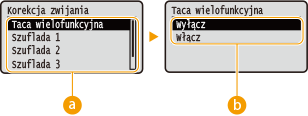 ![]() | Zawiera listę ustawień dotyczących wyglądu regulacji urządzenia, takich jak korekta położenia wydruku dla poszczególnych źródeł papieru i poprawa jakości wydruku, wraz z krótkimi opisami. Ustawienia domyślne są oznaczone znakiem ( ). |