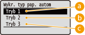 W przypadku wybrania opcji <Tryb 1> ustaw <Wykr. typ pap. autom> na <Nie używaj> dla źródła papieru, które ma być używane. Wykr. typ pap. autom W przypadku niektórych rodzajów używanego papieru po określeniu ustawienia <Tryb 1> lub <Tryb 2> tonery CMYK zużywają się nawet w druku czarno-białym. Szybkość drukowania może też zostać spowolniona. Po określeniu ustawienia <Wyłącz> druk czarno-biały może powodować nierównomierne zabarwienie druku. |
