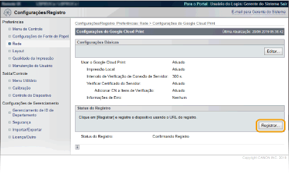 É necessário ativar o Google Cloud Print. Clique em [Editar], selecione a caixa de verificação [Usar o Google Cloud Print] e clique em [OK].