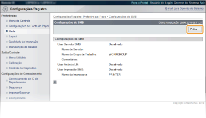 O SMB suporta apenas NetBIOS over TCP/IP e não suporta NetBEUI. Configure o endereço IP antes de configurar as definições SMB. Definir endereços IPO SMB só é ativado quando o cartão SD opcional está instalado na máquina, |