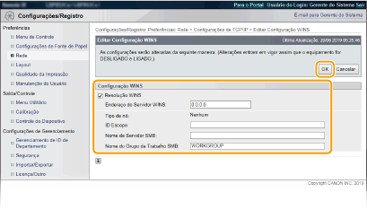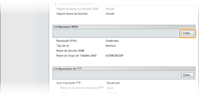 Um nome de grupo de trabalho definido em [Nome do Grupo de Trabalho] em [Configurações de SMB] é usado automaticamente para [Nome do Grupo de Trabalho SMB], se aplicável. Uma alteração ao nome do grupo de trabalho em [Nome do Grupo de Trabalho SMB] também é aplicada a [Nome do Grupo de Trabalho] em [Configurações de SMB].