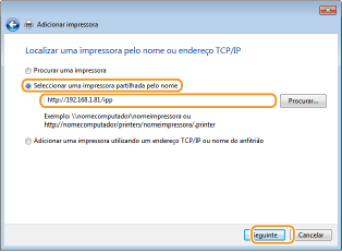 Selecione [Selecionar uma impressora partilhada pelo nome], introduza um destino de ligação e clique em [Seguinte].