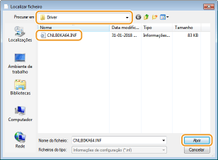 Especifique a pasta onde se encontram os controladores da impressora, selecione o ficheiro INF e depois clique em [Abrir].