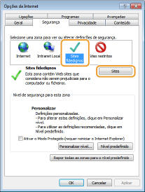 Selecione [Sites fidedignos] no separador [Segurança] e clique em [Sites].