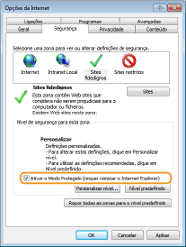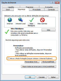 Desmarque a caixa [Ativar o Modo Protegido (requer reiniciar o Internet Explorer)] quando selecionada.