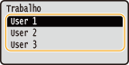 Se estiverem documentos protegidos de dois ou mais utilizadores guardados no cartão de memória, o ecrã de seleção do utilizador, apresentado abaixo, é apresentado no ecrã. Selecione o seu nome de utilizador e prima