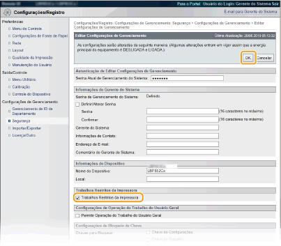 Mesmo com as operações de impressão restringidas, as listas de definições e os relatórios podem ser impressos. Imprimir relatórios e listas |