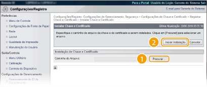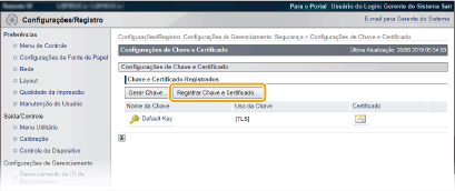 Clique em [Configurações de Chave e Certificado] para instalar um par de chaves ou [Configurações de Certificado CA] para instalar um certificado AC.