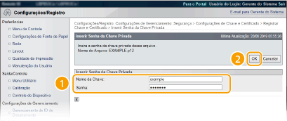 2 | Introduza o nome do par de chaves e a palavra-passe, e clique em [OK]. [Nome da Chave] Introduza carateres alfanuméricos para o nome do par de chaves que pretende registar. [Senha] Introduza carateres alfanuméricos para a palavra-passe da chave privada definida para o ficheiro que pretende registar. |