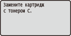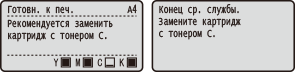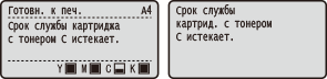 Когда отображается сообщение <Конец ср. службы. Замените картридж с тонером X.>, печать временно останавливается. Для возобновления печати нажмите кнопку  (  ). Конкретное отображаемое сообщение зависит от настройки <Действ. при отс. тнр> в меню настройки на панели управления. Действ. при отс. тнр |
