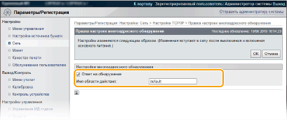 2 | Установите флажок [Ответ на обнаружение] и настройте необходимые параметры. ![]() [Ответ на обнаружение] Установите этот флажок, чтобы настроить аппарат для ответа на пакеты группового обнаружения программного обеспечения управления и разрешить мониторинг с помощью программного обеспечения управления. Если настраивать аппарат для ответа, снимите этот флажок. [Имя области действия] Чтобы включить аппарат в заданную область, введите символы для имени области. |