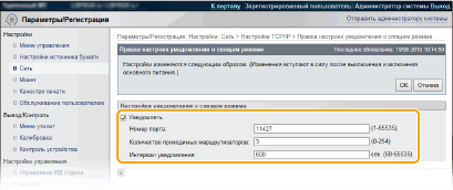 2 | Установите флажок [Уведомлять] и настройте необходимые параметры. ![]() [Уведомлять] Установите этот флажок, чтобы уведомлять программное обеспечение управления о статусе питания аппарата. Если выбран параметр [Уведомлять], аппарат блокирует нежелательный обмен данными в спящем режиме, что позволяет снизить общий уровень энергопотребления. [Номер порта] Измените номер порта для этой функции в соответствии с используемой сетевой средой. [Количество проходимых маршрутизаторов] Укажите количество маршрутизаторов, через которые могут проходить пакеты уведомления. [Интервал уведомления] Укажите интервал отправки аппаратом уведомлений о статусе питания программного обеспечения управления. |