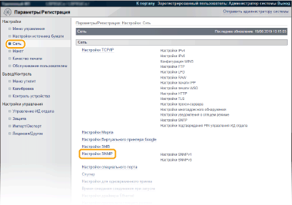 Отключение SNMPv1Если протокол SNMPv1 отключен, некоторые функции аппарата будут недоступны (например, получение сведений об аппарате посредством драйвера принтера). Использование панели управленияДоступ к настройкам SNMP также возможен из меню настройки на панели управления. Настройки SNMP |