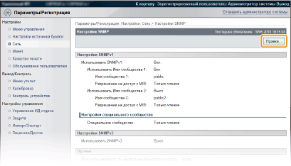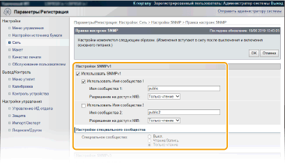 Специальное сообщество представляет собой предварительно настроенное сообщество, ориентированное исключительно на администраторов, использующих программное обеспечение Canon (например, консоль iW Management Console). Выберите полномочия доступа к объектам базы данных MIB [Выкл.], [Чтение/Запись] или [Только чтение].