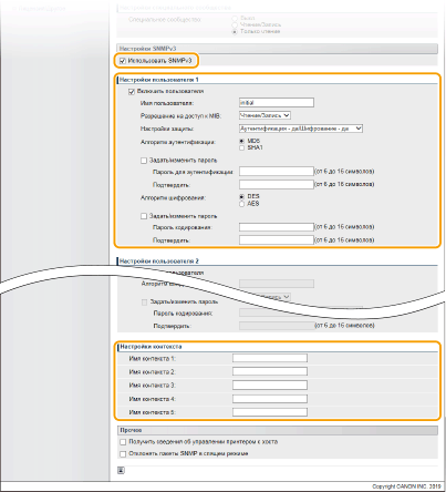 Простой протокол сетевого управления (SNMP) представляет собой протокол для мониторинга и контроля устройств связи в сети с помощью базы данных MIB. Аппарат поддерживает версию протокола SNMPv1 и версию с расширенными функциями безопасности SNMPv3. Статус аппарата можно проверить с помощью компьютера при печати документов или использовать для этого Удаленный ИП. Можно разрешить использование SNMPv1 или SNMPv3 по отдельности или одновременно. Укажите настройки для каждой версии в соответствии с особенностями сетевой среды и конкретными задачами.