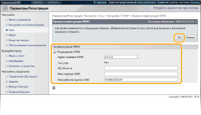 Имя рабочей группы, заданное в поле [Имя рабочей группы] в разделе [Настройки SMB], автоматически используется в качестве [Имя рабочей группы SMB] (при наличии). Изменение имени рабочей группы в поле [Имя рабочей группы SMB] также применяется к полю [Имя рабочей группы] в разделе [Настройки SMB].