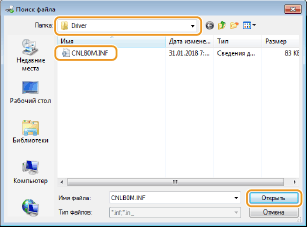 4 | Укажите папку, в которой находятся дополнительные драйверы, выберите файл INF, затем нажмите [Открыть]. ![]() Выберите папку, как показано ниже, в соответствии с операционной системой сервера печати. Если на сервере печати установлена 32-разрядная операционная система Выберите папку [UFR II]-ваш язык-[x64]-[Driver] на диске User Software CD-ROM/DVD-ROM. Если на сервере печати установлена 64-разрядная операционная система Выберите папку [UFR II]-ваш язык-[32BIT]-[Driver] на диске User Software CD-ROM/DVD-ROM. | ||||||